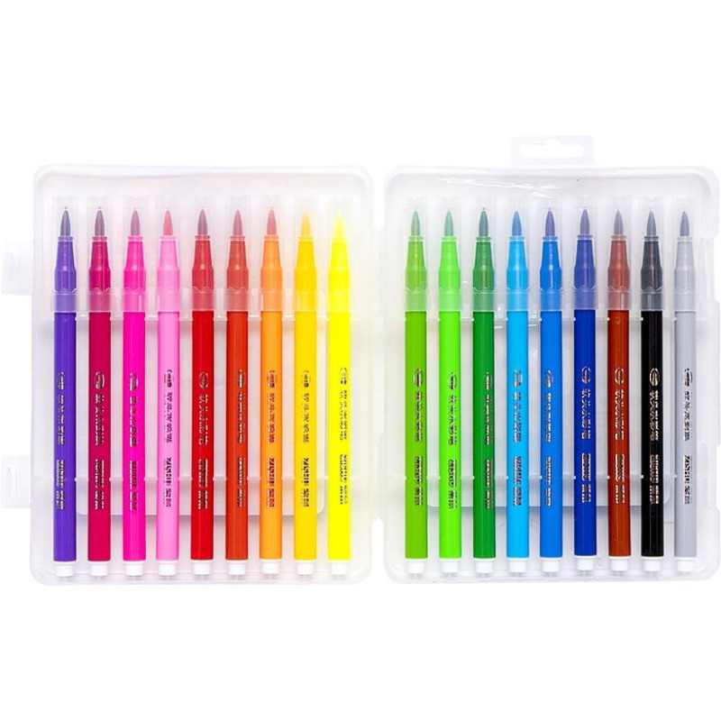 Набір включає 18 фломастерів-пензликів різних кольорів. Вони оснащені вузлом у формі пензлика, що дозволяє наносити лінії шириною від 1 до 4 мм. Чорнило виготовлено на водній основі. Розміри боксу: 14,5*18*3 см.
