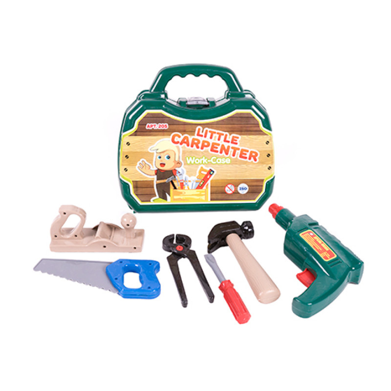 Набір столяра у валізі (арт. 205), дає змогу маляті зберігати весь інструмент в одному місці, ставиться до нього дбайливо й акуратно. У наборі є все необхідне для роботи з деревом - рубанок, ножівка, молоток, кліщі, іграшковий електродриль і навіть стомістка. У будь-яку хвилину малюк буде готовий допомогти татові прибути цвях, відпиляти дощечку або попрацювати рубанком. Завдяки такому набору, дитина з дитячих років привчається до самостійності, працьовитості, поспішає надати допомогу батькам і змайструвати щось своїми руками.