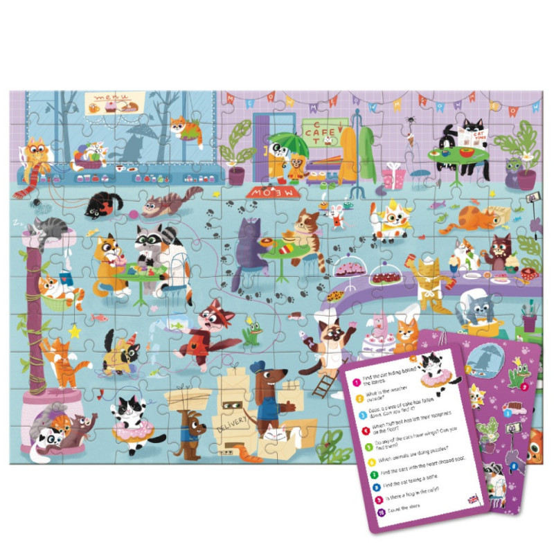 Шукаєте цікавий та розвиваючий пазл для дітей? Подаруйте малюку справжню новорічну пригоду з пазлом "Look & Find Котяче кафе" від бренду Dodo! Цей розвиваючий пазл на 100 елементів поєднує складання з веселою грою на уважність: після завершення картинки дитина має знайти заховані об’єкти за підказками на спеціальних картках.