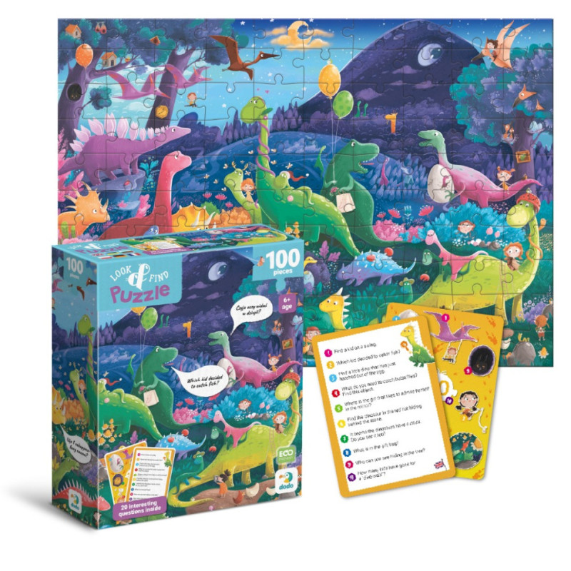 Шукаєте цікавий та розвиваючий пазл для дітей? Подаруйте малюку справжню новорічну пригоду з пазлом "Look & Find Країна динозаврів" від бренду Dodo! Цей розвиваючий пазл на 100 елементів поєднує складання з веселою грою на уважність: після завершення картинки дитина має знайти заховані об’єкти за підказками на спеціальних картках.