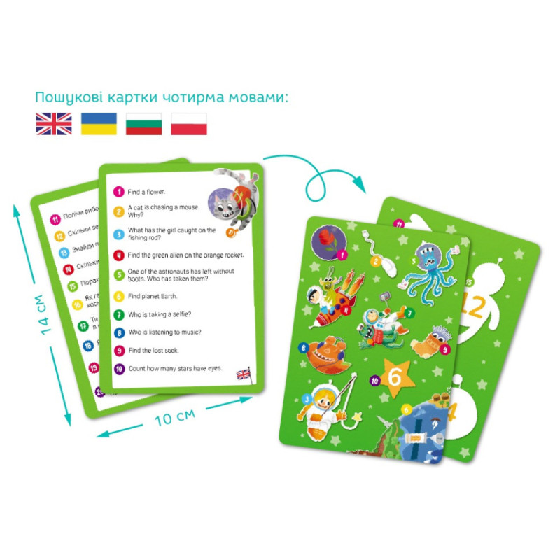 2 двосторонні картки із завданнями (Look & Find) на 4 мовах (англійська, українська. польська, німецька)