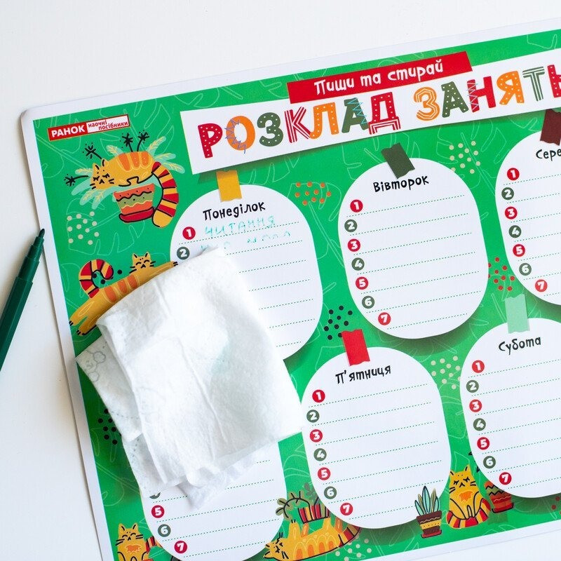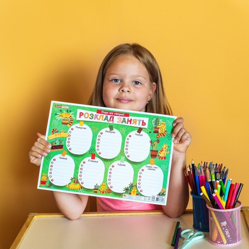 Планшет «Пиши-стирай. Розклад занять» – це односторонній ламінований стенд для зручного запису розкладу занять дошкільників і школярів початкових класів. Це практичний інструмент для організації навчального процесу. Він створений за сучасними вимогами освітніх програм. Щодня можна вносити аж до 7 занять!