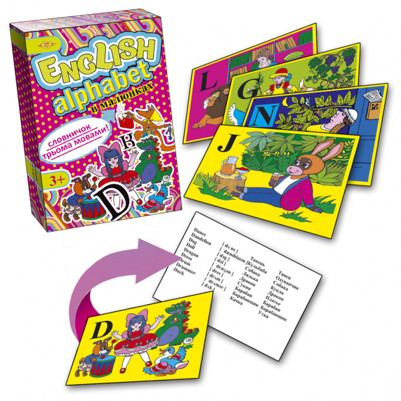 картки-картинки - 26 шт., на звороті кожної картки англо-українсько-російський словничок з транскрипцією.
