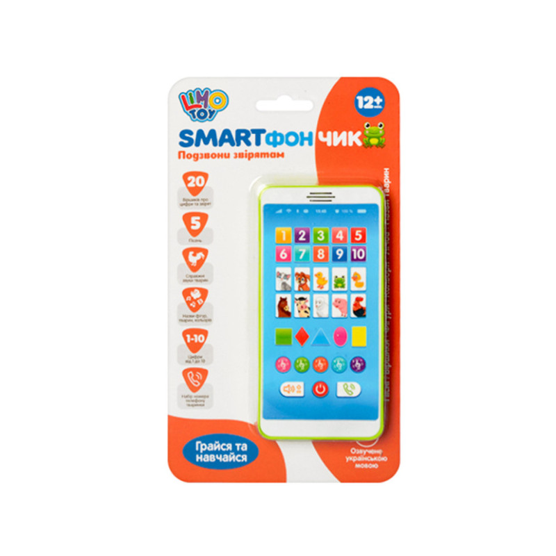 Телефон M 3675 - функціональна, сучасна іграшка для дитини старше 12-ти місяців з безліччю корисних режимів, музичним супроводом і реалістичним, деталізованим дизайном. Дитячий іграшковий смартфончик не залишить байдужою Вашу дитину, який мріє про власний телефоні, як у мами з татом. Тепер малюк зможе не тільки самостійно «дзвонити» по важливих справ, а й розвивати комунікативні навички. Іграшка, озвучена українською мовою, включає в себе 20 віршиків про цифри і звіряток, п'ять пісеньок, справжні звуки тварин, назви фігур і велика кількість інших необхідних для малюка знань. Компактний, зручний у використанні смартфончик допоможе відволікти дитину в дорозі, додасть його дозвіллю різноманітності. Міцний корпус виготовлений з нетоксичного, зносостійкого пластика. Використовуючи цю чудову модель, придумайте для свого непосиди нові навчальні ігри, розучите нові вірші та пісні.