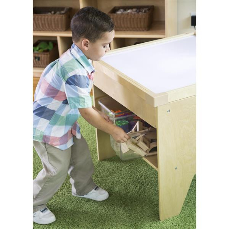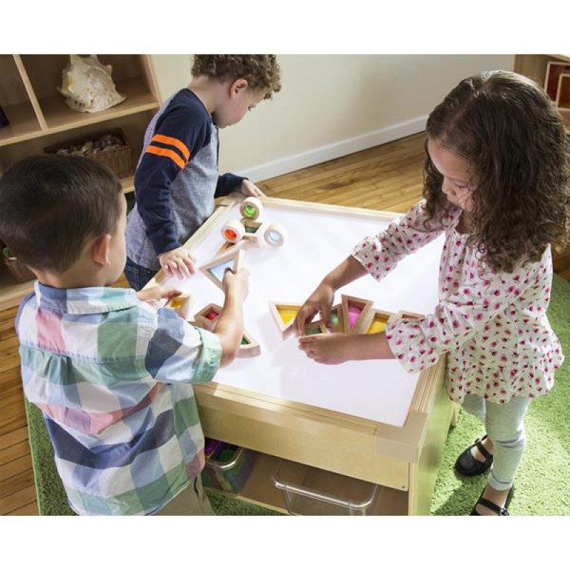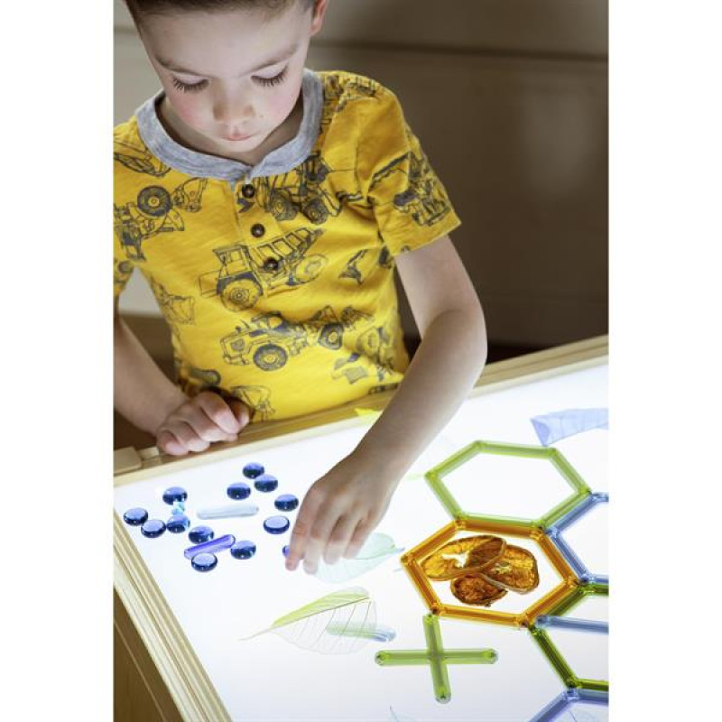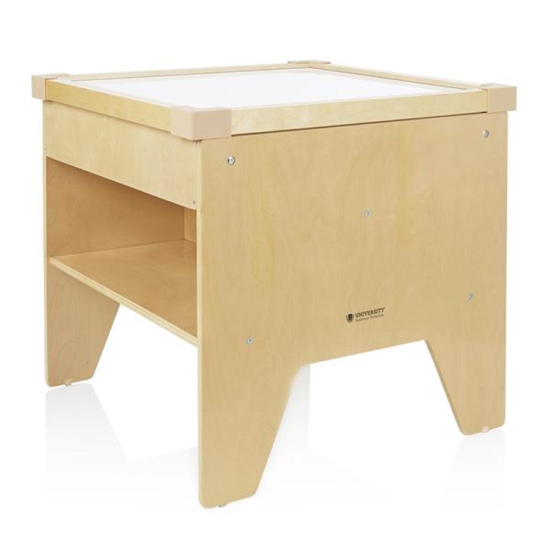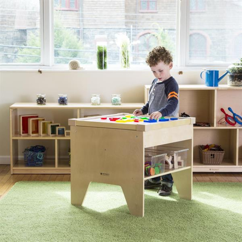 Дитячий світловий стіл University з різнокольоровою підсвіткою підходить для творчих і розвиваючих занять. Світлодіодна панель захована в міцний дерев'яний короб. Є поличка для книг і кошиків з іграшками. Яскравість і колір освітлення регулюється за допомогою пульта управління. Відтінки світлодіодів: білий, червоний, зелений, синій, жовтий, помаранчевий, фіолетовий. Габаритні розміри стола: 58 × 58 × 61 см. Живлення від мережі.Особливості світлового столика столика UniversityРівномірне і м'яке світлодіодне освітлення столу8 варіантів кольору підсвічуванняВідтінки регулюються пультомПрацює від мережі, є вимикачКаркас из натурального дереваПоверхні гладкі і без гострих кутівПосилена конструкціяДокладна інструкція по складаннюІдеї для ігор: анімація з різнокольоровим піском, малювання по льоду аквареллю, вивчення листя і квітів, вивчення фігур за допомогою магнітного конструктора, навчання змішуванню кольорів методом Монтессорі, малювання з використанням трафаретів.Сертифікація: світловий стіл відповідає міжнародним вимогам сертифікатів EN71, ASTM, CARB.