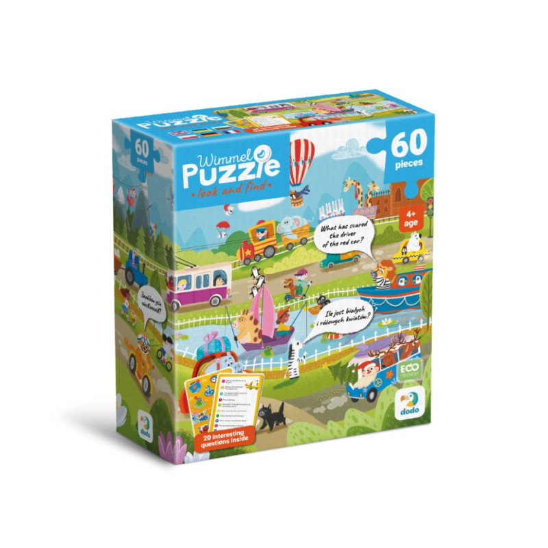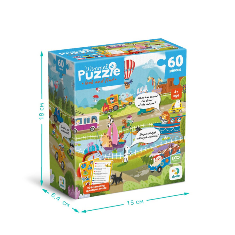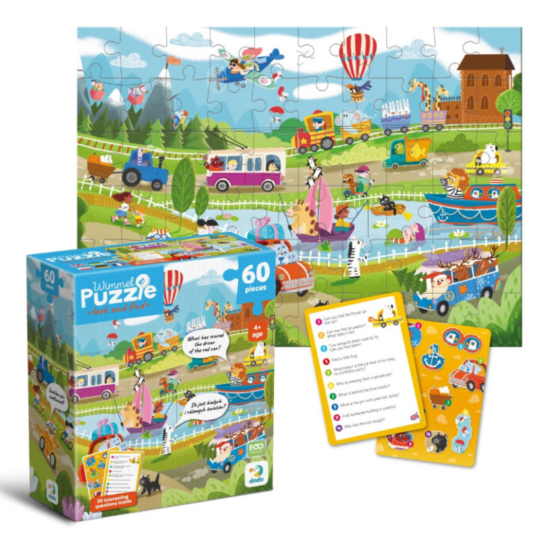 Віммельпазл Dodo "Транспорт" — це яскравий пазл, що складається з 60 елементів і відкриває перед дитиною цікавий світ різноманітного транспорту. На ілюстрації зображено веселі сцени з повітряними кулями, кораблями, автомобілями, тракторами та іншими транспортними засобами, які подорожують мальовничими локаціями.