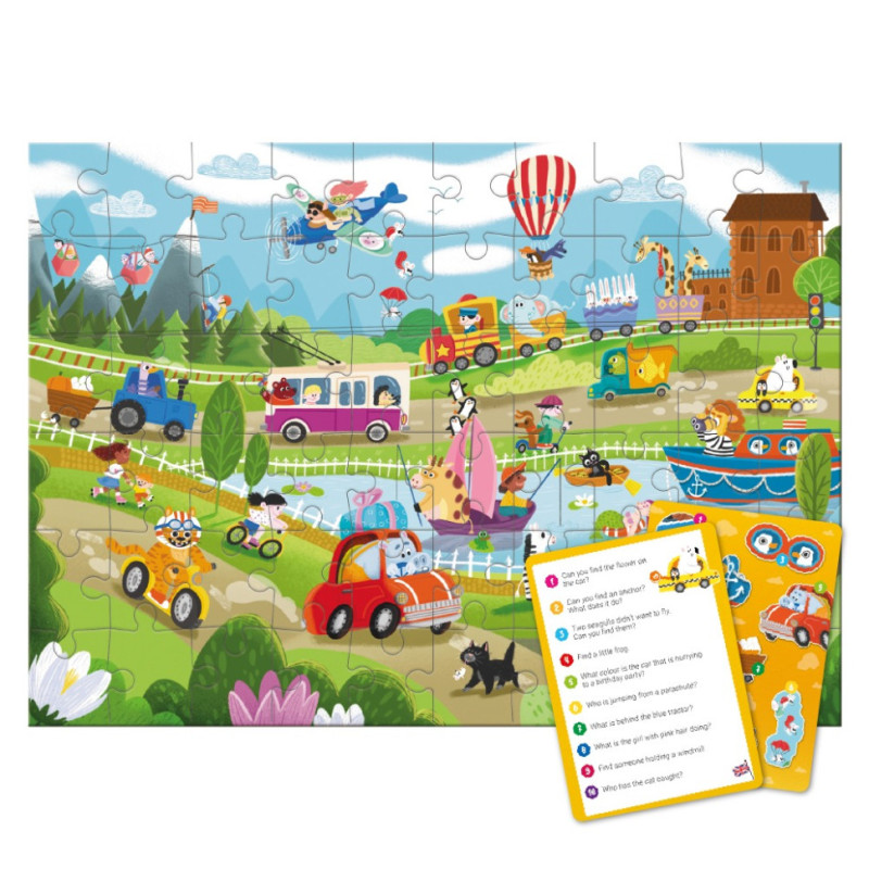 Набір включає картки із завданнями, які додають грі інтерактивності та допомагають розвивати уважність, логічне мислення та уяву. Діти зможуть шукати деталі, виконувати завдання і дізнаватися більше про різні види транспорту.
