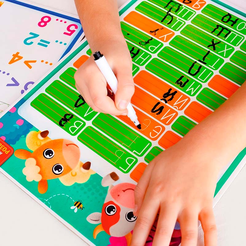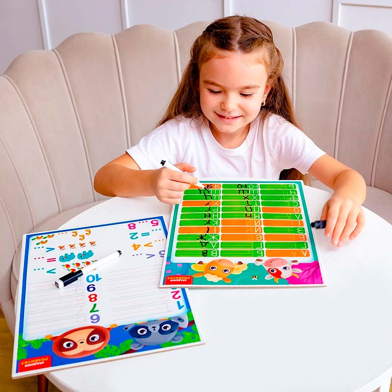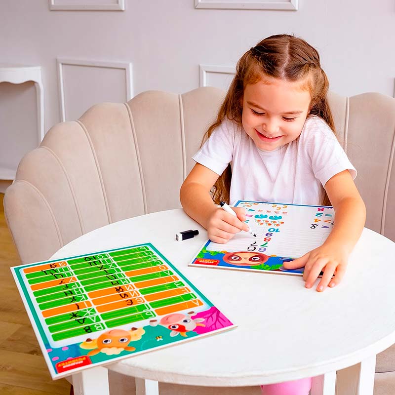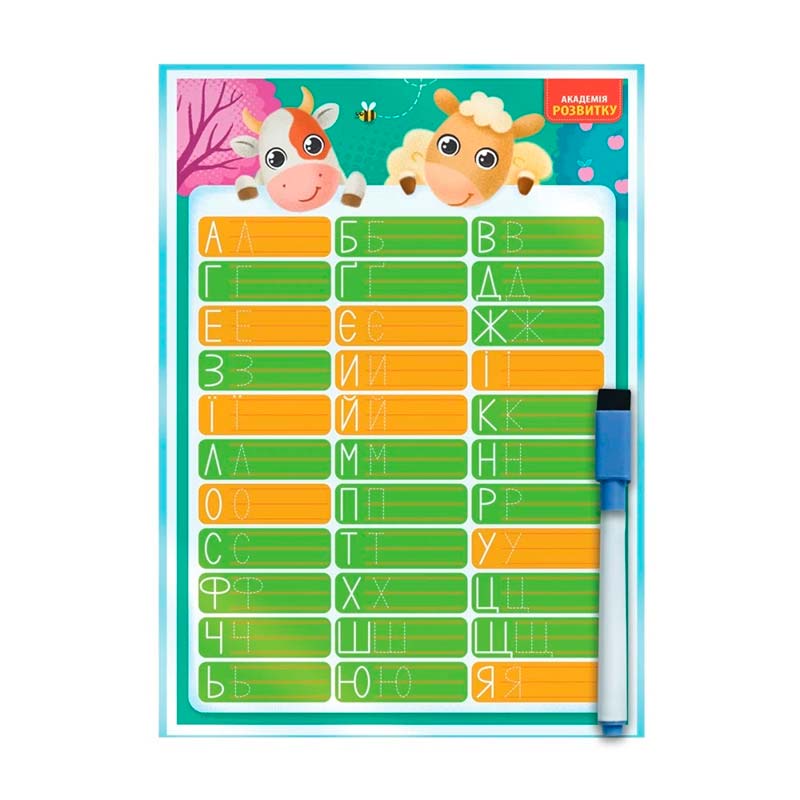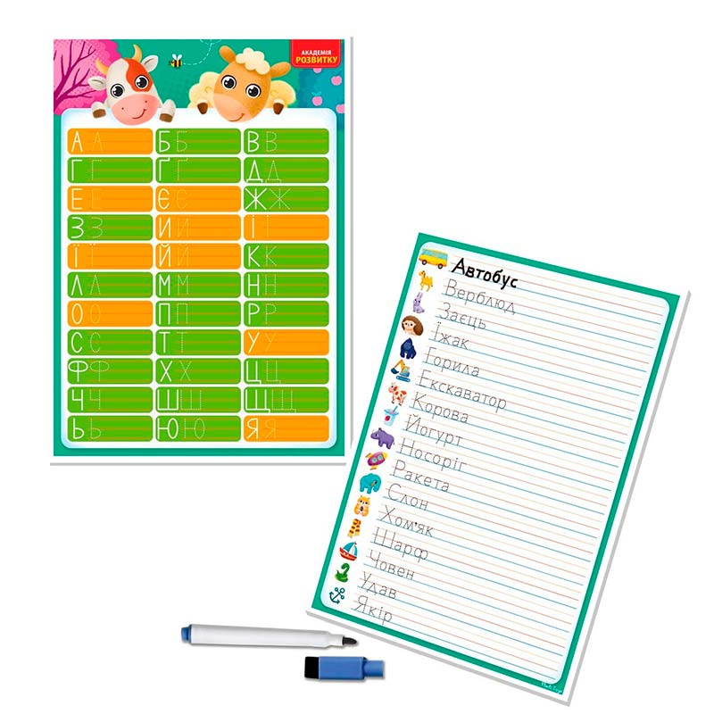 Набір містить двосторонню дошку та багаторазовий маркер. З однієї сторони зображено українську абетку, а з іншої – слова на кожну букву. Дитина може спочатку обвести букви та слова по контурах, а потім написати їх в рядок самостійно.