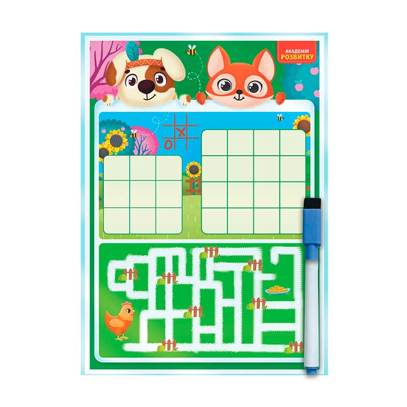 Набір містить двосторонню дошку та багаторазовий маркер. З кожної сторони зображені цікаві завдання та ігри. Дитина може пограти з другом у хрестики-нулики або самостійно пройти через лабіринт та помалювати.