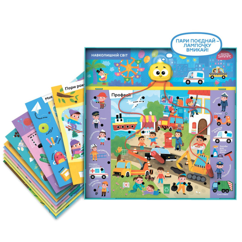Електронна логічна гра KIDDI SMART - ВІКТОРИНА НАВКОЛИШНЄ СВІТ - неймовірна і захоплююча вікторина, яка допоможе дитині дізнатися багато цікавого про навколишній світ. Треба знайти і правильно поєднати логічні пари: тварин і їхні будинки, пори року і заняття, людей і професії, страви і їхні інгредієнти, і багато іншого!