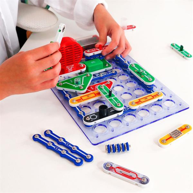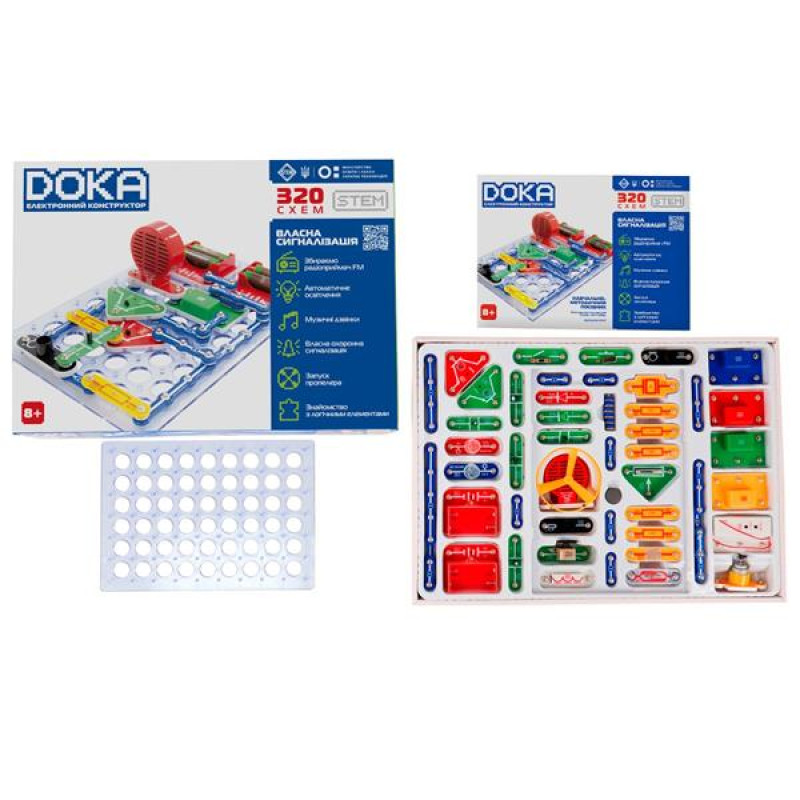 Конструктор електронний DOKA «320 СХЕМ» безсумнівно сподобається юним дослідникам!Збираючи конструктор, дитина познайомиться з дивовижним світом електроніки в ігровій формі. У схемах використовується ручне, магнітне, світлове, водяне, звукове, електричне, а також сенсорне керування. Завдяки оригінальному способу з’єднання деталей ви зможете домогтися швидкого і ефективного результату без використання паяння.За допомогою конструктора можна зібрати такі схеми:радіоприймачавтоматичний освітлювачмузичний дзвінокігри та іграшкиімітатор звуків (звуки іграшкового бластера, зоряних воєн, сигнали машини швидкої допомоги зі світловим супроводом, сигнал тривоги)охоронна сигналізація та багато іншого.Конструктор складається з наступних елементів:Сполучні дроти.П'єзовипромінювач.Сенсорна пластина.Геркон (магнітнокеруючий контакт) з магнітом.Кнопковий вимикач.Вимикач.Фоторезистор.Червоний світлодіод.Лампа 2.5 В.Кріпильні тримачі для батарейок.Динамік.Інтегральна схема музична.Інтегральна схема сигнальна.Інтегральна схема 'зоряні війни'.Електромотор з пропелером.Антена.Зелений світлодіод.Лампа 6 В.Мікрофон.Інтегральна схема 'підсилювач потужності'.Резистори 100 Ом, 1 кОм, 5 кОм, 10 кОм, 100 кОм.Конденсатори 0.02 мкФ, 0.1 мкФ, 10 мкФ, 100 мкФ, 470 мкФ.Інтегральна схема 'підсилювач високої частоти'.PNP транзистор.NPN транзистор.Реостат.Інтегральна схема 'FM діапазон'.Також в інструкції до конструктора міститься 136 ілюстрацій і 320 описів схем, які ви можете зібрати.Електронний конструктор розвиває у дитини:дрібну моторикууважністьлогічне мисленняпамятьматематичні здібності.Для роботи потрібні 4 батарейки типу АА (не входять до комплекту).Рекомендовано для дітей віком від 8 років.