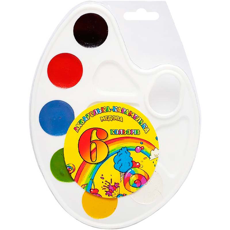 Фарби акварельні медові на 6 кольорів в пластиковій палітрі з прозорою кришкою, з європідвісом. Без пензлика. Створені спеціально для дітей. Мають широку палітру яскравих і чистих кольорів. Фарби легко змішуються, зберігаючи насиченість і чистоту тону. Швидко сохнуть. Легко набираються на пензель і розносяться по поверхні аркуша. Широко використовуються для дитячої творчості, а також для художніх, оформлювальних і декоративно-прикладних робіт. Безпечні при використанні за призначенням.