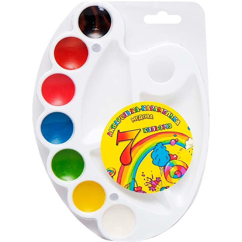 Фарби акварельні медові на 7 кольорів в пластиковій палітрі з прозорою кришкою, з європідвісом. Без пензлика. Створені спеціально для дітей. Мають широку палітру яскравих і чистих кольорів. Фарби легко змішуються, зберігаючи насиченість і чистоту тону. Швидко сохнуть. Легко набираються на пензель і розносяться по поверхні аркуша. Широко використовуються для дитячої творчості, а також для художніх, оформлювальних і декоративно-прикладних робіт. Безпечні при використанні за призначенням.