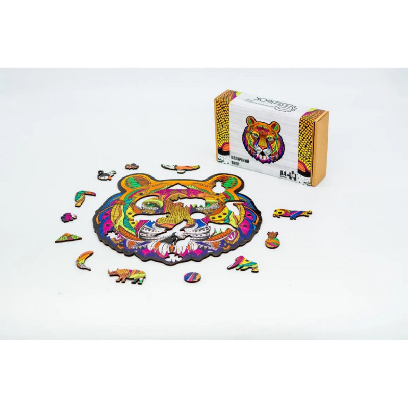 Відчуйте силу та грацію дикої природи з цим фігурним дерев'яним пазлом "Величний Тигр"! Формат А4, унікальні елементи, що складаються в захоплюючий образ тигра. Екологічно чистий матеріал та зручна картонна упаковка роблять цей пазл чудовим вибором для любителів величних тварин.