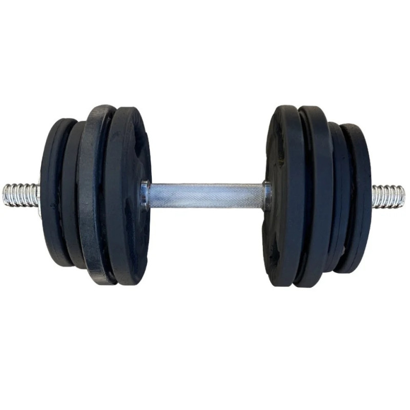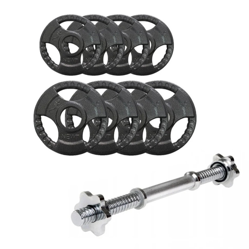Комплектація: 1 гриф довжиною 40 см, 2 гайки; 4 диски по 2,5 кг, 4 диски по 1.25 кг.