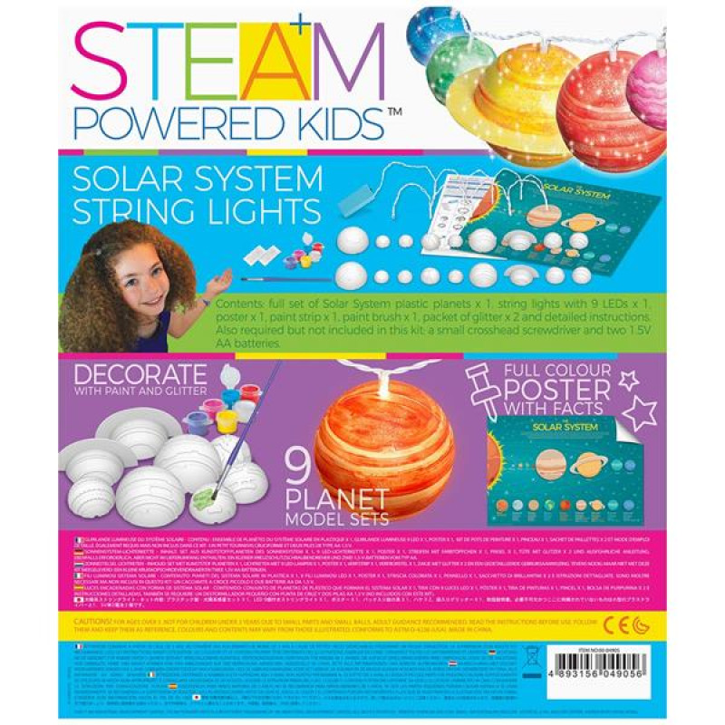 Вивчіть основи астрономії та прикрасьте свою кімнату яскравою різнобарвною гірляндою з лампочками у вигляді планет Сонячної системи! Вам не доведеться збирати складні механізми чи моделі. Ви цікаво проведете час, розфарбуєте макети планет, запам'ятаєте їх назви і розташування відносно Сонця, декоруєте свою кімнату.У науковому наборі ви знайдете пензлик, фарби і пластикові макети планет, які так цікаво розфарбовувати! Зібрати половинки небесних тіл буде нескладно #8211; кожна з них підписана. Це Сонце, Меркурій, Венера, Земля, Марс, Юпітер, Сатурн, Уран, Нептун. Додатково для гірлянди знадобляться дві батарейки AA.Приємним бонусом стане пакетик з блискітками. Декоруйте ними планети на вашій гірлянді. Насипте трохи блискіток на макет планети, доки фарба не висохла. У кінці інструкції ви знайдете цікаві факти про планети Сонячної системи.Набір із серії STEAM Powered Kids буде цікавий дівчаткам молодшого шкільного віку від 8 років. Гра з таким комплектом для розвитку тренує уяву, мислення, колірне сприйняття, художні навички, знайомить із тим, як влаштований Всесвіт. Цей набір від 4М підходить для занять у рамках STEAM-педагогіки.У наборі:Гірлянда з 9 лампочками #8211; 1 шт.Півкулі моделей планет #8211; 18 шт.Набір фарб #8211; 1 шт.Пензлик #8211; 1 шт.Пакетик із блискітками #8211; 1 шт.Плакат #8211; 1 шт.Інструкція #8211; 1 шт.
