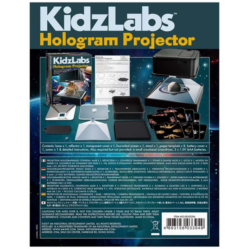 Вивчіть принципи створення тривимірних голограм і зберіть власний голографічний проектор із науковим набором від 4М! Влаштуйте дивовижну виставу для друзів. Розглядайте об'ємні зображення динозавра, космонавта, декоративної рибки, планети та інші. Усього в комплекті 8 голограм.Набір із серії KidzLabs буде цікавий дітям молодшої школи від 8 років. Він допоможе отримати знання з фізики, розвинути уяву, інтелект, мислення, підвищити емоційне благополуччя. Науковий набір підходить для освіти в рамках реджио-педагогіки.У комплекті є всі необхідні деталі для збирання голографічного проектора. Додатково потрібні невелика хрестова викрутка, дві батарейки типу ААА. Як працює пристрій? Батарейки живлять світлодіод, закріплений у підставці. Коли промені світла проходять крізь паперові шаблони, на чотирибічному екрані з'являється проекція. Екран виконує роль дзеркала, відбиваючи частину світла. Ви бачите тривимірне об'ємне зображення, яке ніби зависло в повітрі. Це #8211; оптична ілюзія голограми. Ви можете розглядати її під різними кутами.У театральних постановках і кінематографі часто використовують ефект голограми для створення привида. Зображення актора, який перебуває під сценою, відбивається скляним екраном і проектується на сцену. Винахідником цього фокусу був Джон Пеппер.У наборіПідставка #8211; 1 шт.Відбивач #8211; 1 шт.Прозора кришка #8211; 1 шт.Чотирибічний екран #8211; 1 шт.Стенд #8211; 1 шт.Паперові шаблони #8211; 8 шт.Кришка батарейного відсіку #8211; 1 шт.Гвинт #8211; 1 шт.Інструкція #8211; 1 шт.