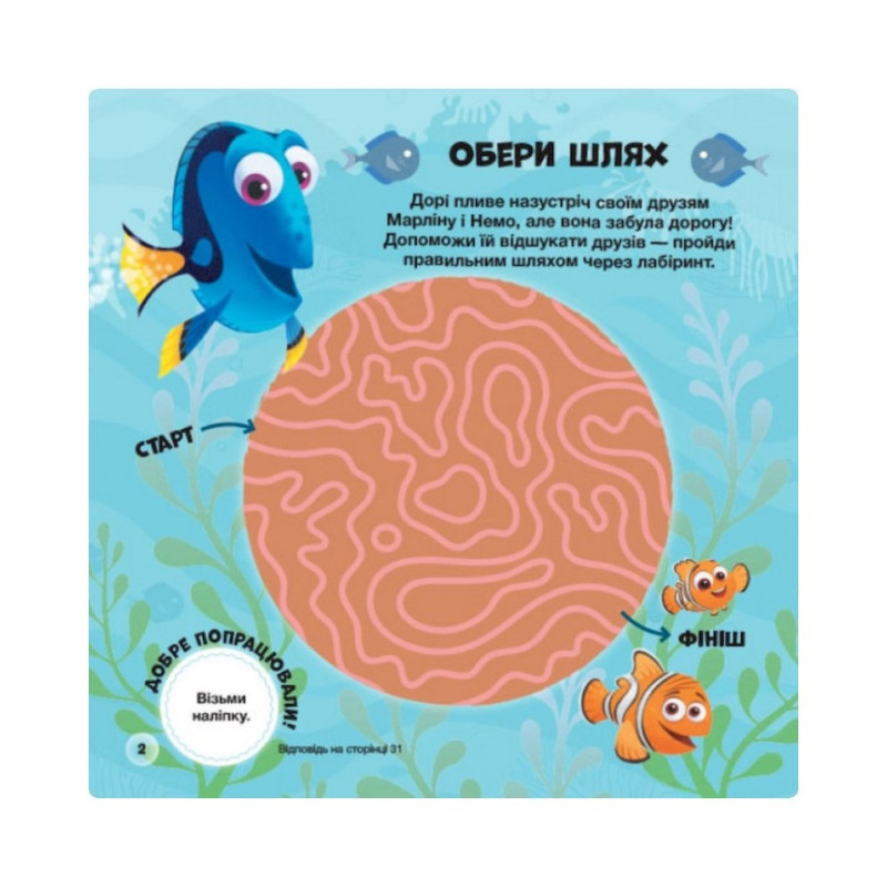 Приєднуйся до фантастичних пригод рибки Дорі та її друзів! Мандруй разом із ними океаном: проходь лабіринти, складай судоку, шукай відмінності та, звичайно ж, клей наліпки. Безліч цікавинок з героями цієї "підводної" книжки!