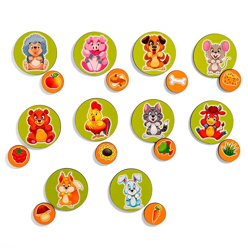 Весела та яскрава дидактична гра допоможе закріплювати знання малечі про свійських та диких тварин (що вони їдять);