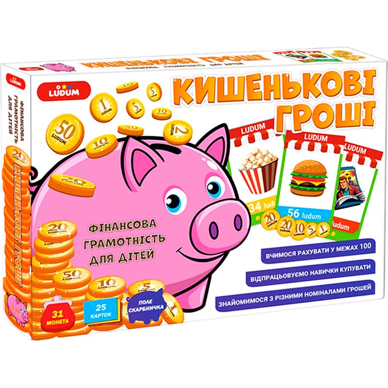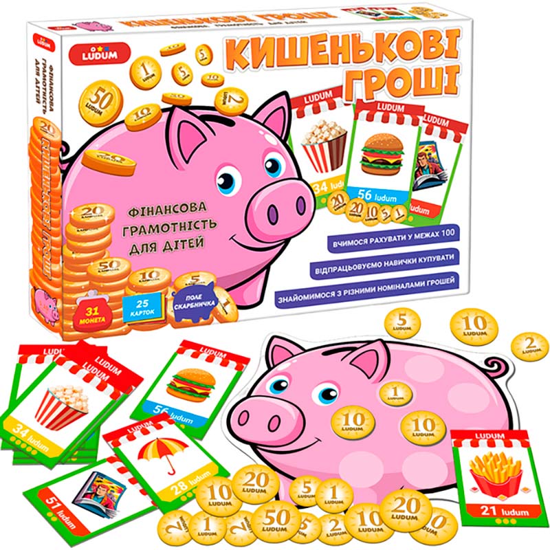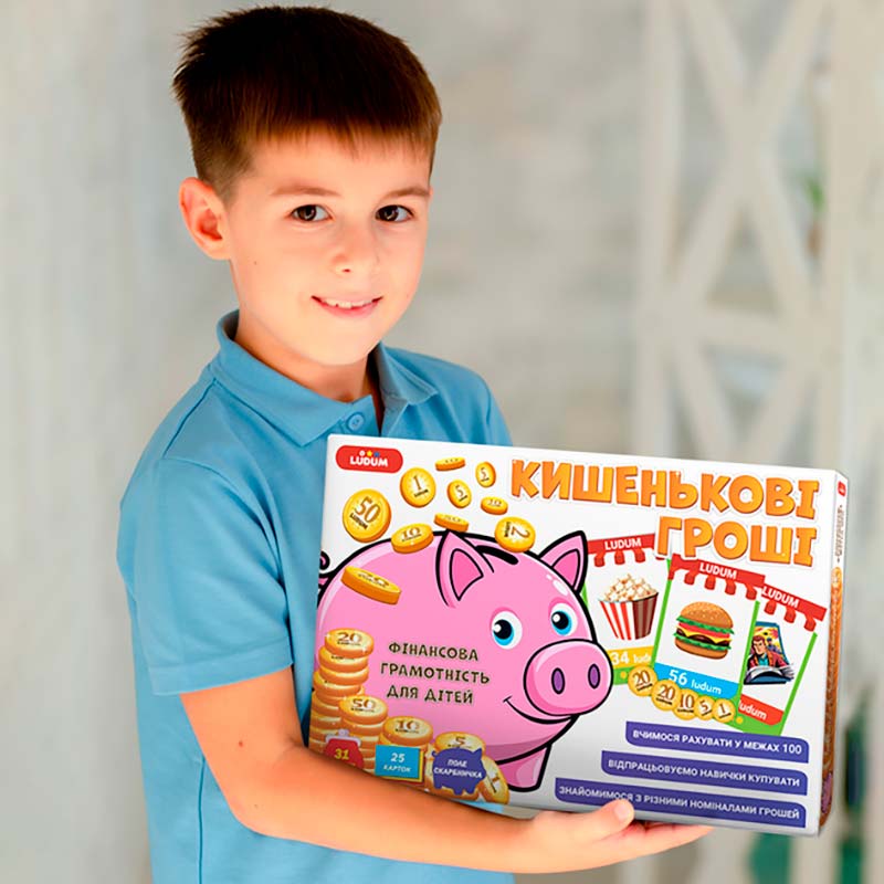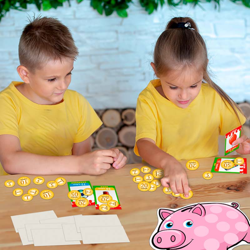 Настільна гра Кишенькові гроші призначена для дітей дошкільного та раннього шкільного віку.