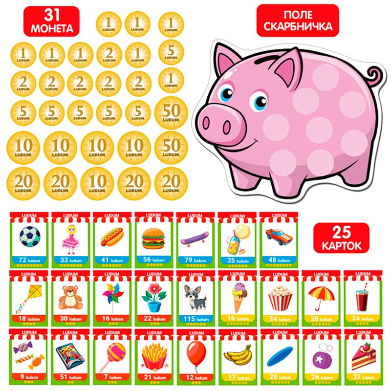 У коробці ви знайдете поле-скарбничку, монети та картки з товарами та цінами.