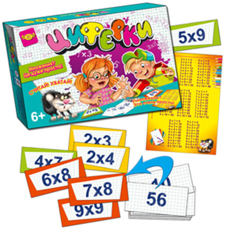Гра Циферки - динамічна гра, що розвиває навички швидкого рахунку, уважність і швидкість реакції. На 53 двосторонніх картках з одного боку розташований приклад на множення, з іншого боку число - відповідь на завдання. Почувши і побачивши завдання картки, кожен з гравців прагне першим вирішити його (знайти правильну відповідь), знайти картку з відповідним числом і забрати її. Перевернувши її, він озвучує для всіх гравців нове завдання. Переможцем стане гравець, який зібрав протягом гри найбільшу кількість карток. Вчимо таблицю множення граючи! Комплектація: картки-плашки ігрові із завданнями та відповідями - 56 шт, таблиця множення - 1 шт, правила гри російською та українською мовами. Виробник може змінювати кольорову гаму товару без попередження. Наявність кольорів уточнюйте у менеджера компанії.