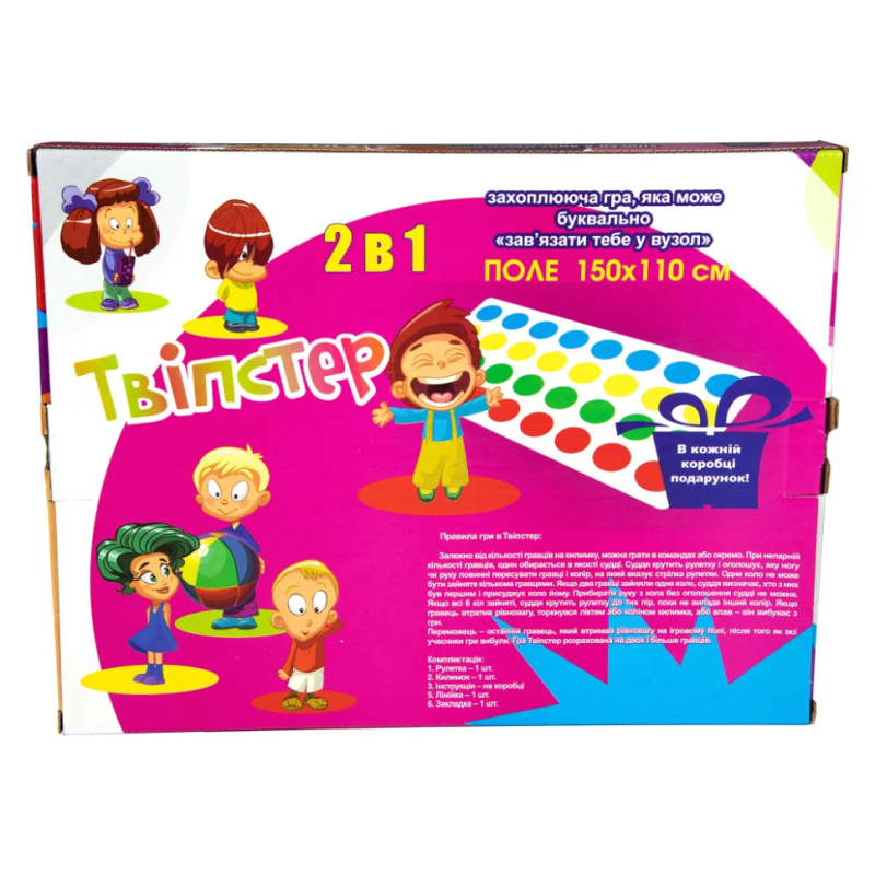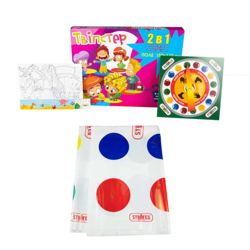 Весела і барвиста гра «Твістер» для великої компанії (11256, Strateg) - кращий спосіб здружитися, розважитися і випробувати гнучкість своєї розтяжки! Віддатися грі можна на будь-якій поверхні, будинку або на газоні. Переможе найбільш спритний і пластичний гравець! Правила гри дозволяють отримати перемогу за рахунок свій винахідливості і правильно прорахованих ходів. Головна особливість набору - наявність рулетки. Вона вкаже, хто першим робить хід і куди потрібно ставати. Іноді доводиться практично зав'язуватися у вузол! Запропонуй своїм товаришам приєднатися і грайте максимальною кількістю учасників.