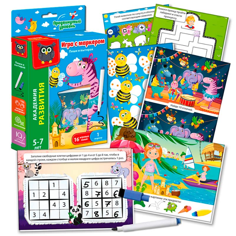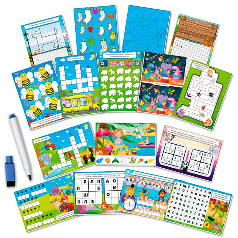 Як грати: розгляньте картки разом із дитиною. Нехай малюк по черзі бере картки та виконує завдання на логіку, увагу, пам’ять і просторове мислення. Усі лінії легко витираються губкою на звороті маркера — можна грати знову!