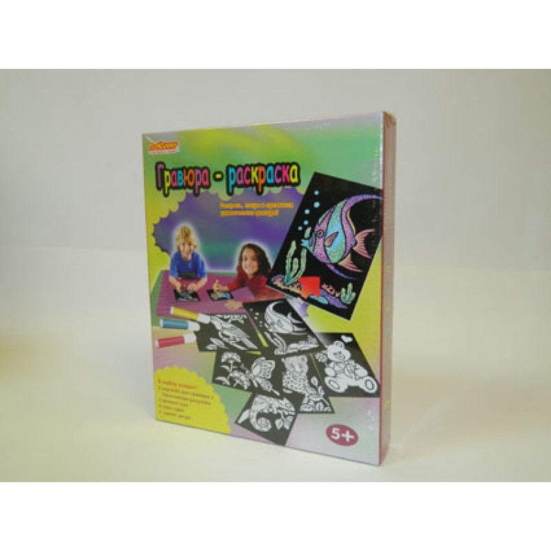 Гравюра-розмальовка "Art Lover". До комплекту входять: 6 карток для гравюри з нанесеним малюнком, 3 фломастери, 6 підставок, 1 клапоть фетру.