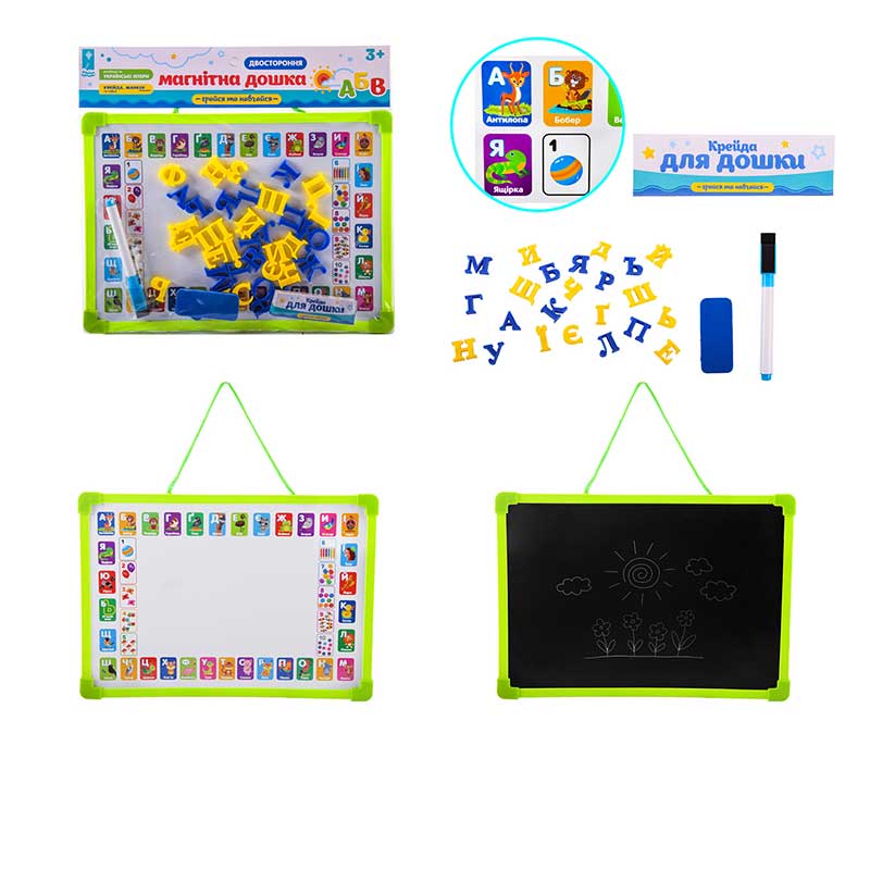 Іграшка дощечка 2-х стор PL-7005 (KI-7005) (96шт/3) укр-рос.магнит.алфавит,мелки, маркер,стиралка, у пакеті 30*28 см, р-р іграшки – 30*21.5*1.2 см