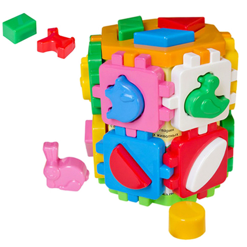Сортер Куб Розвиваючий малюк - оснащений різноманітними геометричними фігурками та фігурками тварин, які вставляються у відповідні ніші основи.