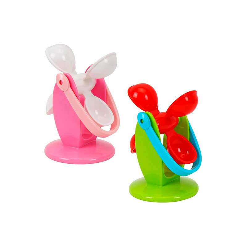 Стійка основа, м’якенька ручка, а головне – крильчатка млинка крутяться. Лопаті починають рух, якщо полити їх водичкою або просто подути. Такий процес гарантує здивовані погляди малечі та щасливі й приємні моменти гри.