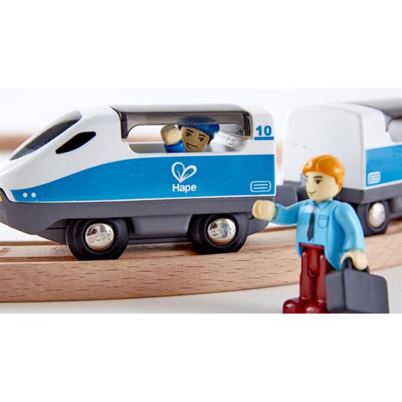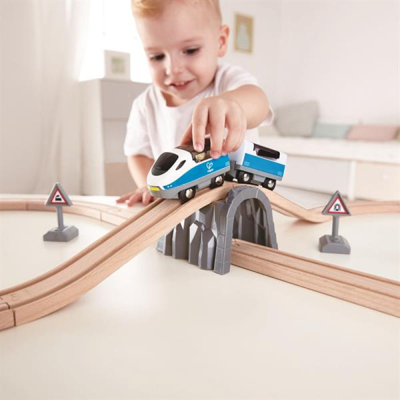 Червоний означає стоп, зелений #8211; вперед! Розкажіть дітям про сигнали безпеки за допомогою цієї іграшки від Hape. Що в наборі: рейки, потяг з 2-х вагонів, тунель-гірка, 2 знака безпеки, залізничний світлофор, кондуктор і пасажир.Батарейки для роботи іграшки не потрібні. Дитина штовхає поїзд самостійно.Дерев'яна залізниця Hape з пасажирським поїздом (E3729) складається з 26 елементів. Набір відповідає міжнародним стандартам якості EN 71 і ASTM F963. Рекомендований вік: 3 роки.
