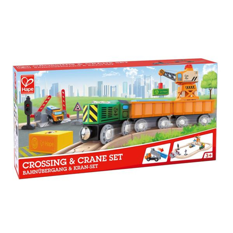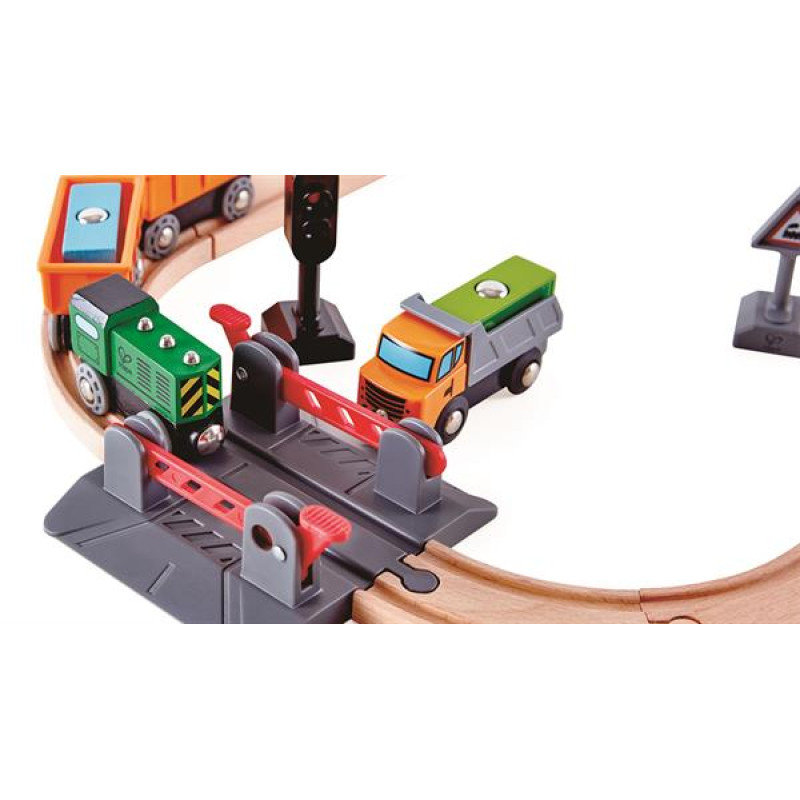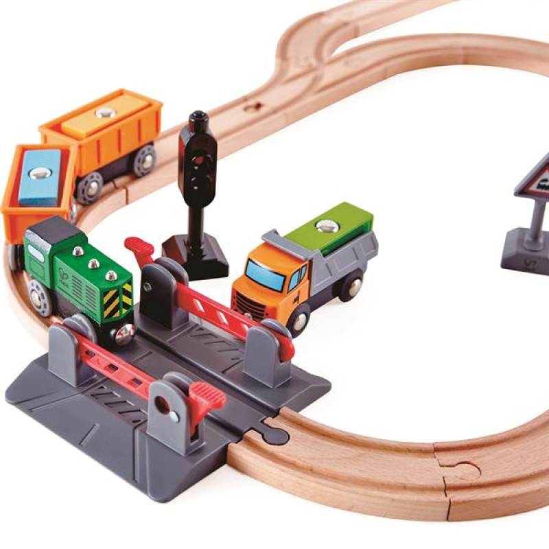 Будьте уважні на залізничному переїзді! Коли на переїзді опускається шлагбаум, наближається поїзд.Батарейки для роботи іграшки не потрібні. Працює без батарейок. Дитина штовхає поїзд самостійно.У складі цього реалістичного набору для доставки залізничних вантажів є працюючий магнітний кран, поїзд з 3 вагонів, залізничний переїзд, функціональний самоскид, світлофор, застережливий знак і набір рейок. Дерев'яна залізниця Hape з краном (E3732) складається з 34 елементів. Набір відповідає міжнародним стандартам якості EN 71 і ASTM F963. Рекомендований вік: 3 роки.