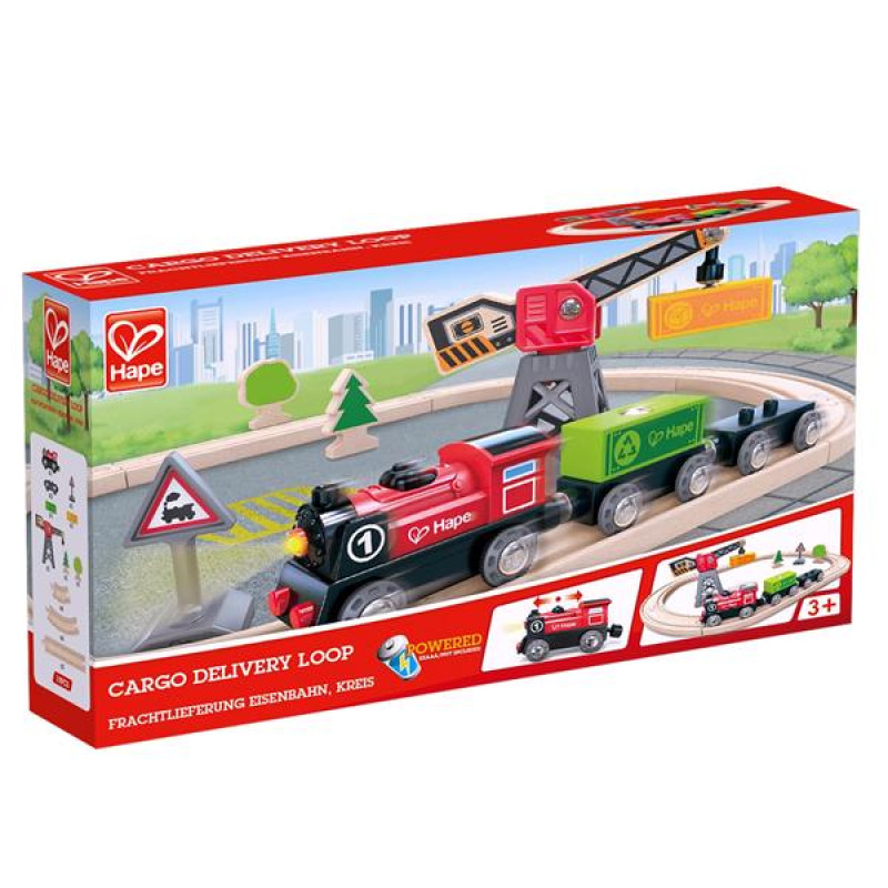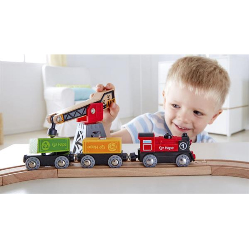 Пасажири чекають на свій багаж! Скористайтесь магнітним краном, щоб завантажити контейнери на поїзд. Потім натисніть кнопку на головному вагоні, щоб об'їхати овальну колію і здійснити доставку. Для роботи потрібно 2 батарейки ААА (не входять в комплект). Поїзд їздить самостійно.В наборі: рельси, вантажний потяг з 3-х вагонів, кран з магнітною лебідкою, 2 дерева, застережливий знак. Набір сумісний з іншими дерев'яними залізницями від Hape. Залізниця Hape Доставка вантажів (E3731) складається з 19 елементів. Набір відповідає міжнародним стандартам якості EN 71 і ASTM F963. Рекомендований вік: 3 роки.