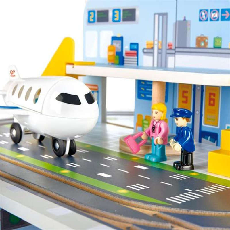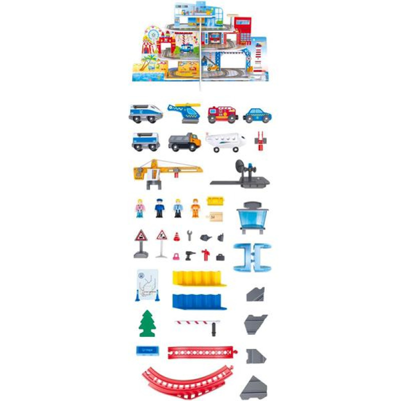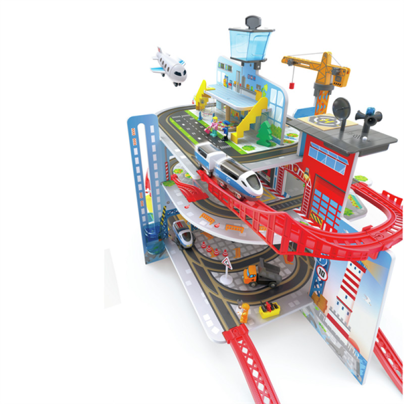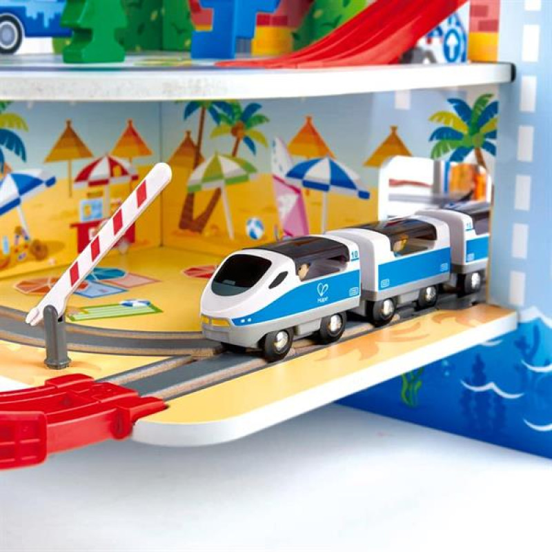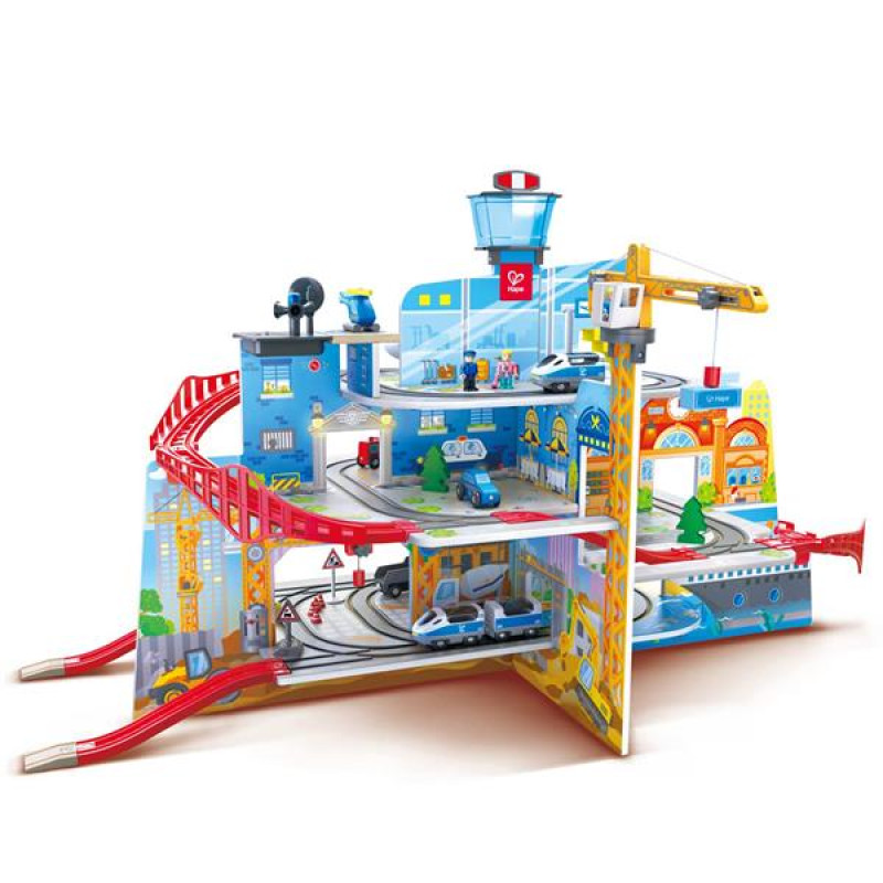 Іграшкова залізниця Hape Місто з трьома рівнями містить аеропорт, морський порт, парк розваг, поліцейську ділянку, будівельний майданчик, пожежну станцію та пляжні краєвиди.Ігровий набір включає: одна трирівнева ігрова база, три сходи, один літак, один ліфт, одна вантажівка, один вантажний блок, три вагони, одна козловий кран, одна поліцейська ділянка, одна пластикова вигнута рейка, чотири пластикові підйомні рейки, одна багажна карусель, чотири фігурки, одна підйомна брама, чотири ділянки дороги, одна сторожова вежа, один ящик для інструментів з чотирма інструментами, один кран, три причали, одне дерево, двоє воріт, один транспортний знак.Трирівнева іграшкова залізниця Hape Місто чудово підходить для заохочення розповідання історій та творчої гри, розвитку дрібної моторики.Для дітей віком від 3 років.Батарейки: у комплекті 2 батареї LR44 (для підсвітки).Розміри у зібраному вигляді: 114 x 63 x 65 см.Поїзд потрібно штовхати руками.