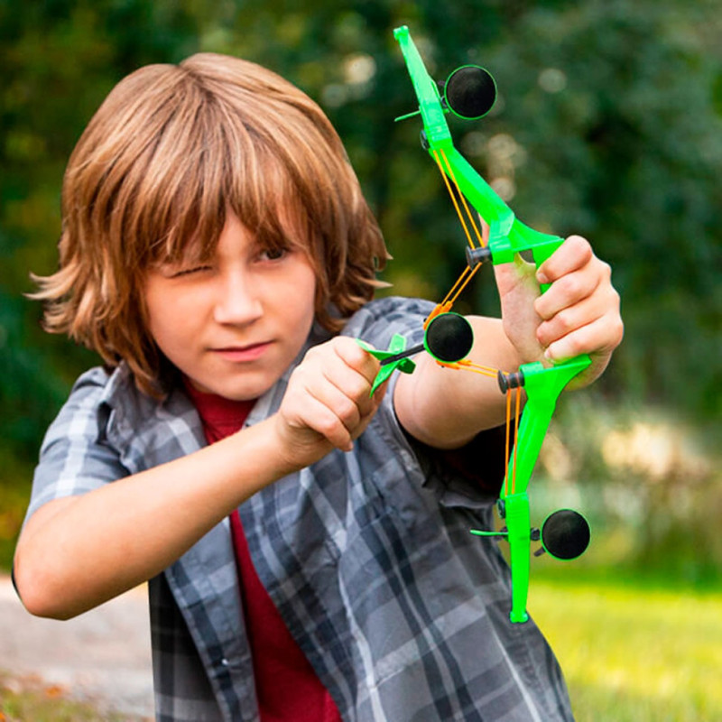 До комплекту входить: лук іграшковий, 3 стріли з м'якими наконечниками-присосками та розкладна мішень 45 сm з тканини.