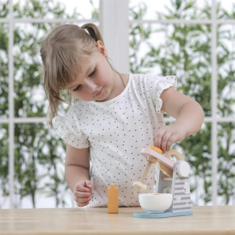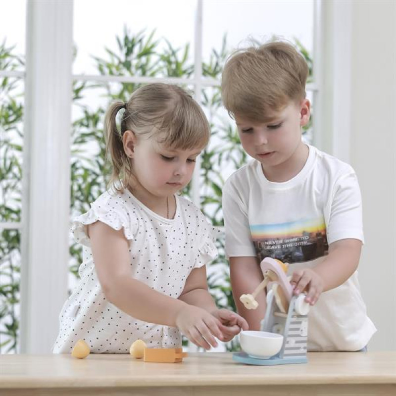 Мама готує крем або тісто для випічки? Маленький помічник тут як тут! З іграшковим міксером PolarB з дерева дитина може грати в приготування різних страв, «пригощати» рідних і друзів. Набір юного кухаря складається з дерев'яного міксера і миски, а також іграшкових продуктів #8211; пачки борошна і яйця з дерева. Комплект буде цікавий дітям дошкільного віку від 3 років.Розвивальна іграшка PolarB у вигляді дитячого кухонного приладу тренує уяву, соціальні навички, мислення, самостійність. Вона дає можливість дитині спробувати себе в новій ролі, придумати сюжет для гри, більше дізнатися про кулінарію, розвинути вміння спілкуватися та емпатію.Діти вчаться, наслідуючи дорослих. Домашні справи, приготування їжі #8211; цікаві та зрозумілі ігри для дитини. Спочатку вона насипає в миску трохи борошна, розбиває яйце. Піднімає ручку і ставить ємність під вінчик. Обертає ручку, змішуючи інгредієнти. Усі деталі та продукти #8211; з дерева. Жодного безладу та необхідності прибирати. Набір кулінара дає уявлення про будову приладів, рецепти страв. Батарейки не потрібні.Розмір дитячого міксера 15 х 15 х 8,7 см. Розвивальна дерев'яна іграшка PolarB виготовлена в пастельному забарвленні, рукоятка у вигляді мордочки ведмедика. Набір від сертифікований за європейським EN71 і американським ASTM стандартами якості та безпеки.У комплекті міксер, миска, дві половинки яйця, пачка борошна.
