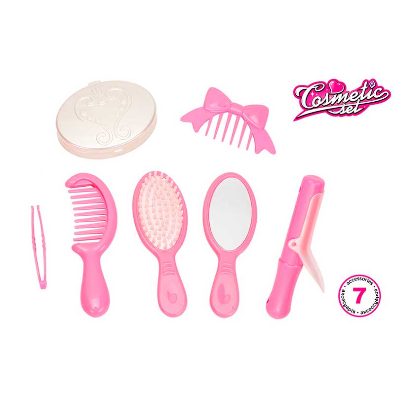 У комплекті є все необхідне для щоденно догляду: гребінець, щітка та шпилька у формі бантика для модної зачіски. Якщо ж хочеться кучерявих локонів - у пригоді стане плойка. Дзеркальце з ручкою, пінцет та пудрениця будуть завжди під рукою для ідеального макіяжу.