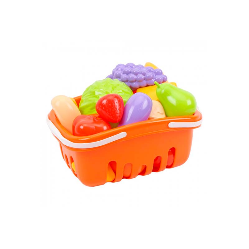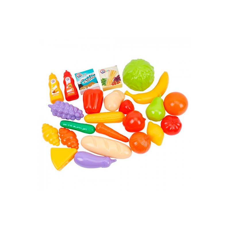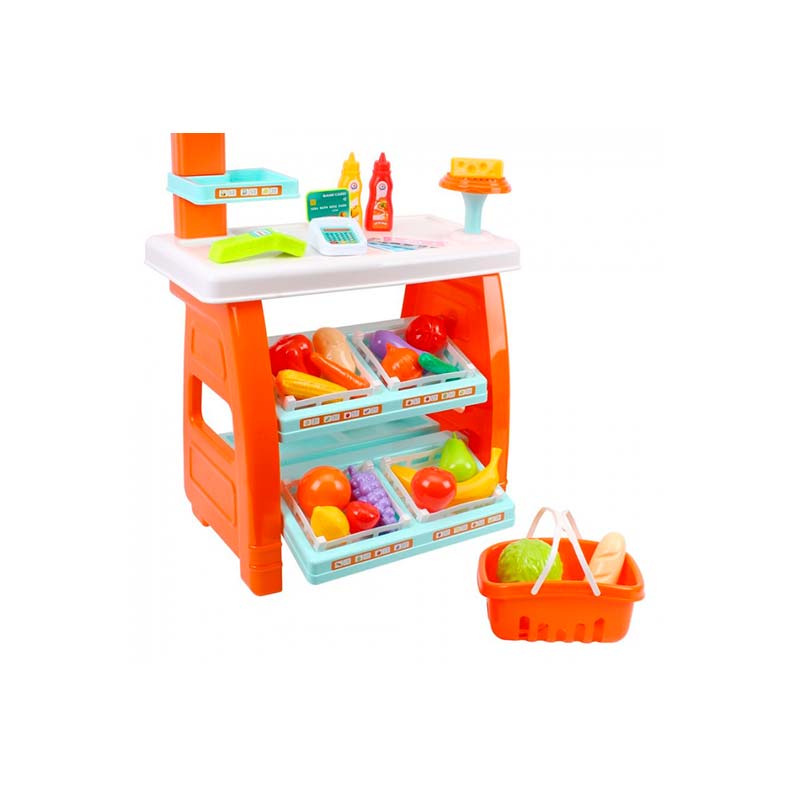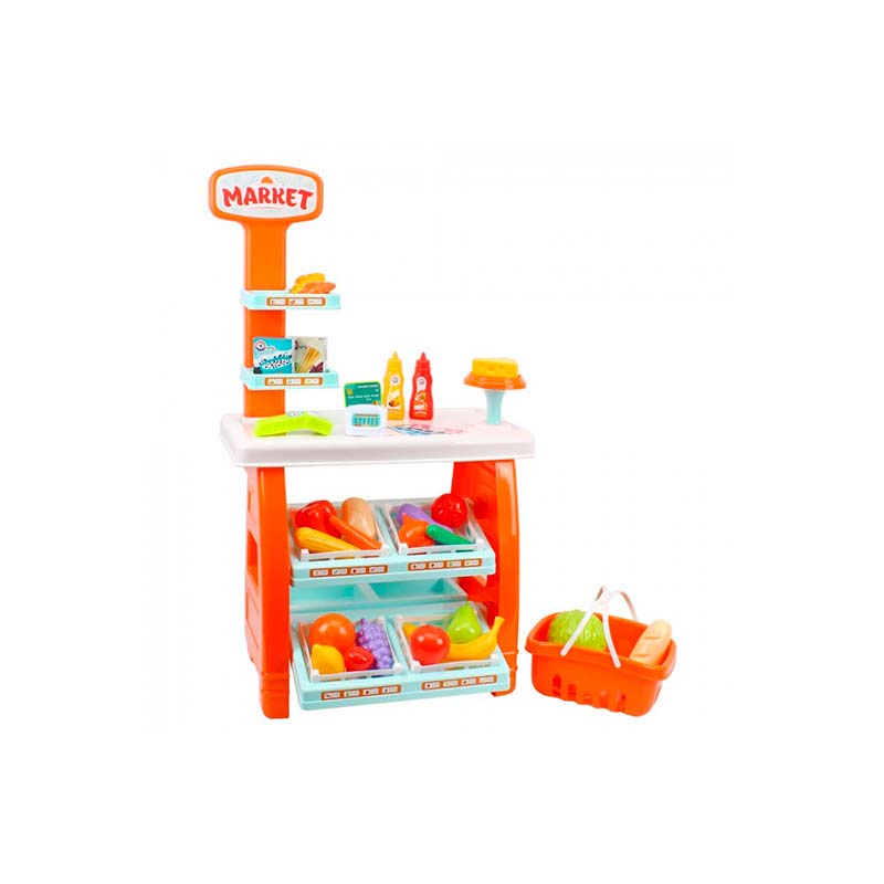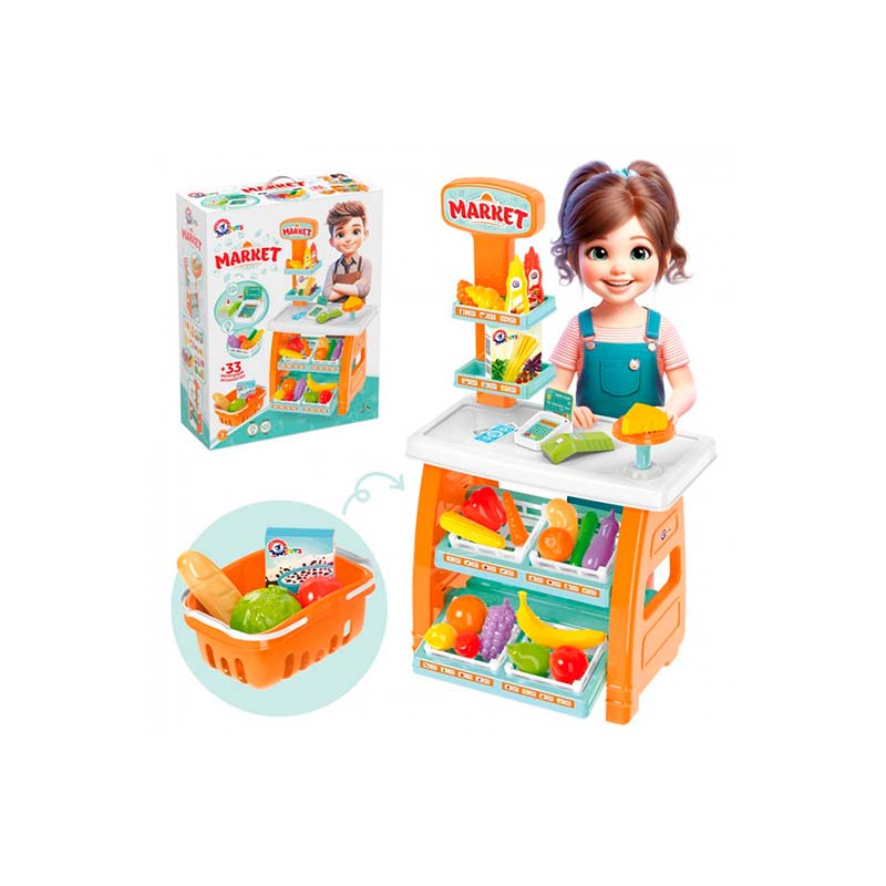 У наборі є прилавок з полицями для ящичків з різноманітними корисними та апетитними іграшковими продуктами: від соковитої полуниці та стиглих бананів до ароматного батона й сиру. У крамниці чималий асортимент: круасани, батон, сир, капуста, картопля, кукурудза, огірок, помідор, морква, перець, баклажан, цибуля, груша, яблуко, банан, виноград, лимон, апельсин, полуниця. На прилавку є тортівниця для презентації найсмачніших продуктів і додаткові верхні полиці для акційних товарів, дві картонні коробочки із спагеті та пластівцями + 2 пляшечки із кетчупом і гірчицею.