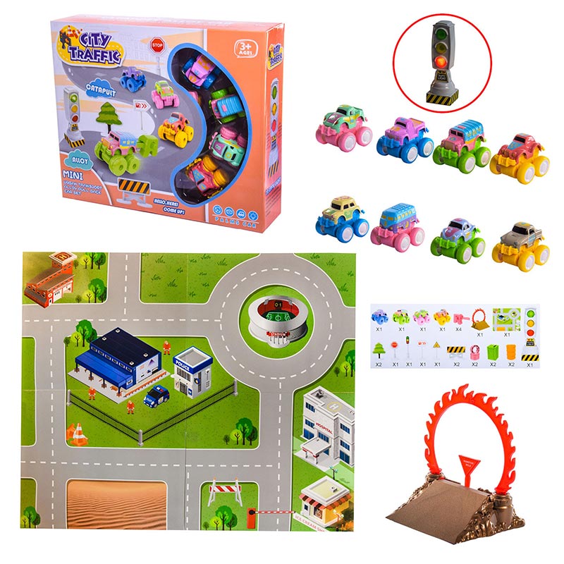 Ігровий простір з дорожньою розміткою, кілька іграшкових автомобілів та набір аксесуарів для облаштування міста — усе необхідне для творчих ігор і довготривалого інтересу.