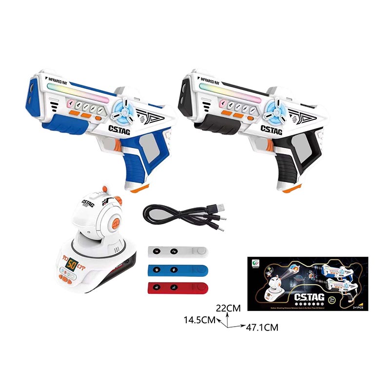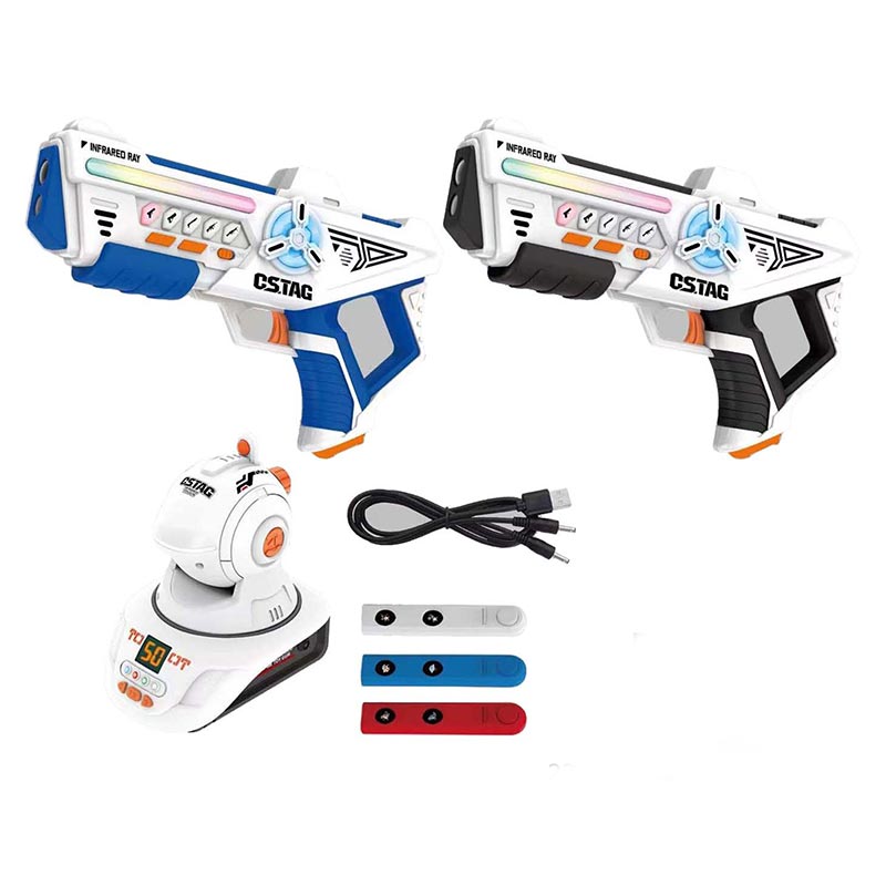 Це веселий наборчик для активних ігор — простий у використанні та безпечний для дітей. Набір працює на безпечному інфрачервоному випромінюванні, яке таке ж, як у пультів від телевізорів, тож можна грати як у приміщенні, так і на вулиці.