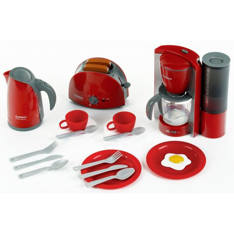 Дитячий набір для сніданку Klein Bosch - незамінна річ на кухні кожної маленької господині. Тепер Ваша дитина зможе приготувати сніданок своїм лялькам та навіть батькам.У набір входить:- чайник, який можна наповнити водою та бачити кількість набраної рідини;- тостер, який під час увімкнення кнопки опускає тостери всередину, а при готовності вони вискакують назовні;- кавоварка;- смажене яйце, 2 тарілочки, 2 вилочки, 2 ніжочки, 2 ложечки, 2 блюдця, 2 чашки, 2 кухонні ложки.Набір виготовлений із якісного матеріалу та з допустимими функціями для дітей від 3-х років.Поставляється без батарейок та акумуляторів.