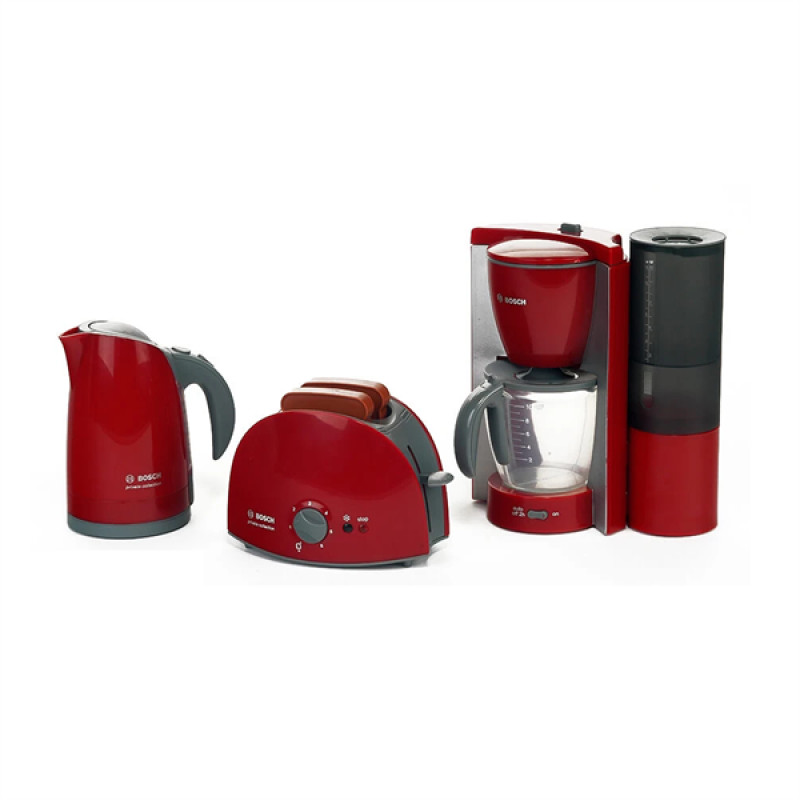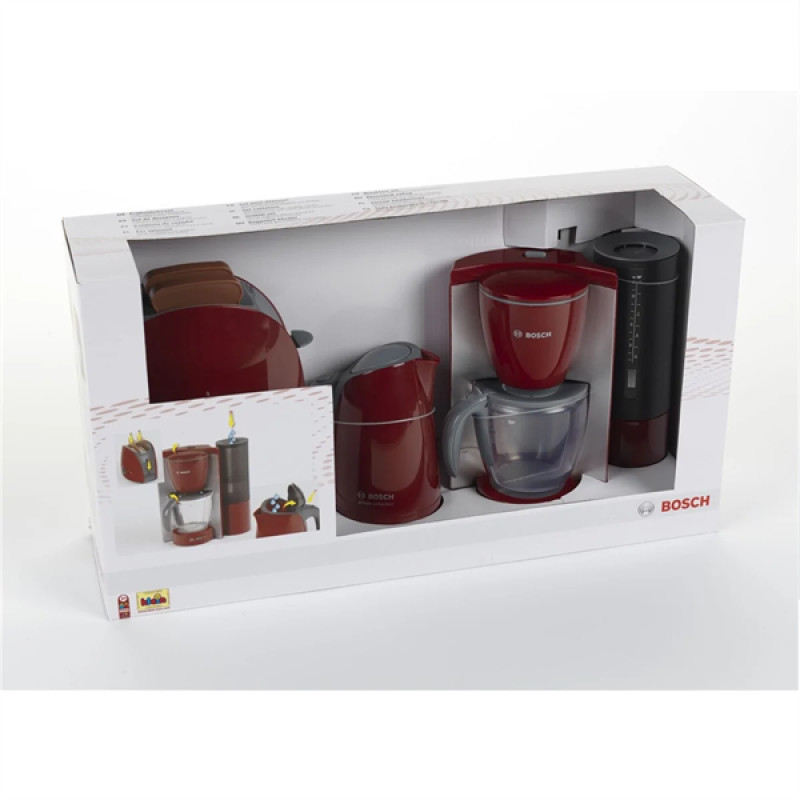 Klein Bosch mini Техніка для сніданку - набір із дуже реалістичних та безпечних для дитини іграшкових приладів (імітацій справжньої техніки виробництва німецького концерну BOSCH). Ліцензійні іграшки у веселій формі познайомлять вашого малюка з принципом роботи справжнього електрочайника, тостера та кавоварки. Приготувати смачний сніданок, як це роблять дорослі - тепер не проблема!Особливості:- кольори та форми іграшок ідентичні оригінальним пристроям, що робить ігри з ними ще більш реалістичними;- тостер із поворотним перемикачем таймера - при натисканні на кнопку пластикові тости (2 шт.) опускаються всередину та вискакують назовні при 'готовності';- іграшковий чайник із індикатором рівня рідини можна наповнювати водою як справжній;- іграшкова кавоварка з можливістю заповнення водою та реалістичною подачею води;- висота чайника становить 13 см, а кавомашини - 19 см.Приладдя серії Bosch mini може бути чудовим доповненням до інших кухонних наборів Klein.
