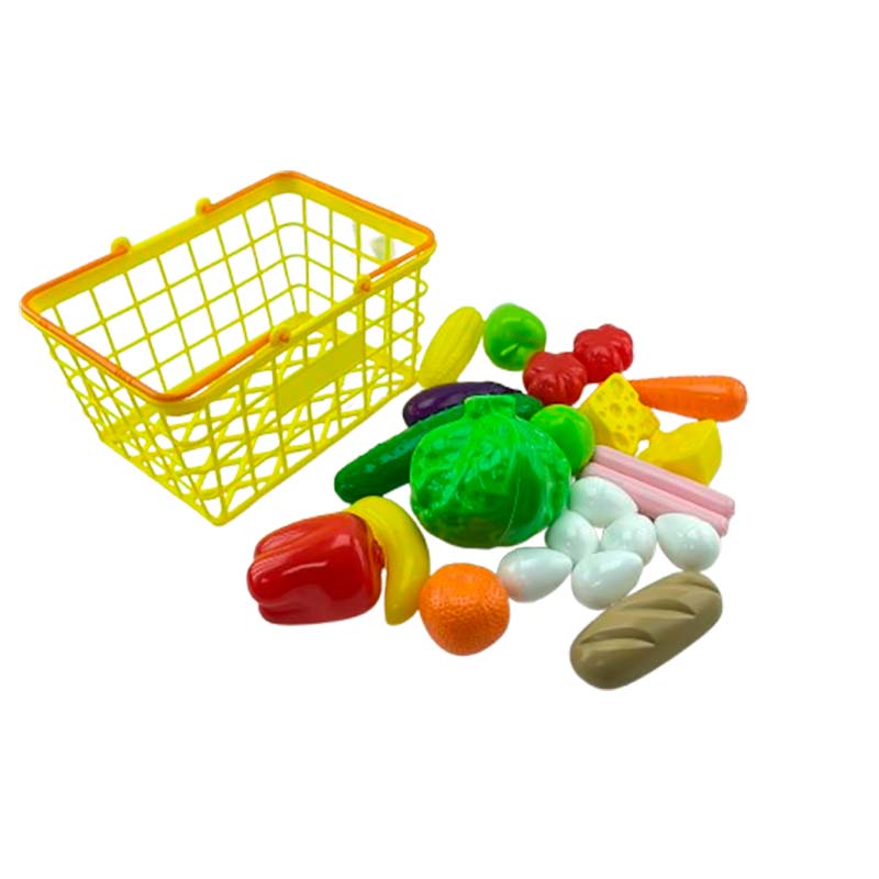 До набору входить 27 предметів — барвисті продукти, зручні для дитячих ручок. Кошик додає грі реалістичності та сприяє розвитку уяви, моторики й соціальних навичок дитини.