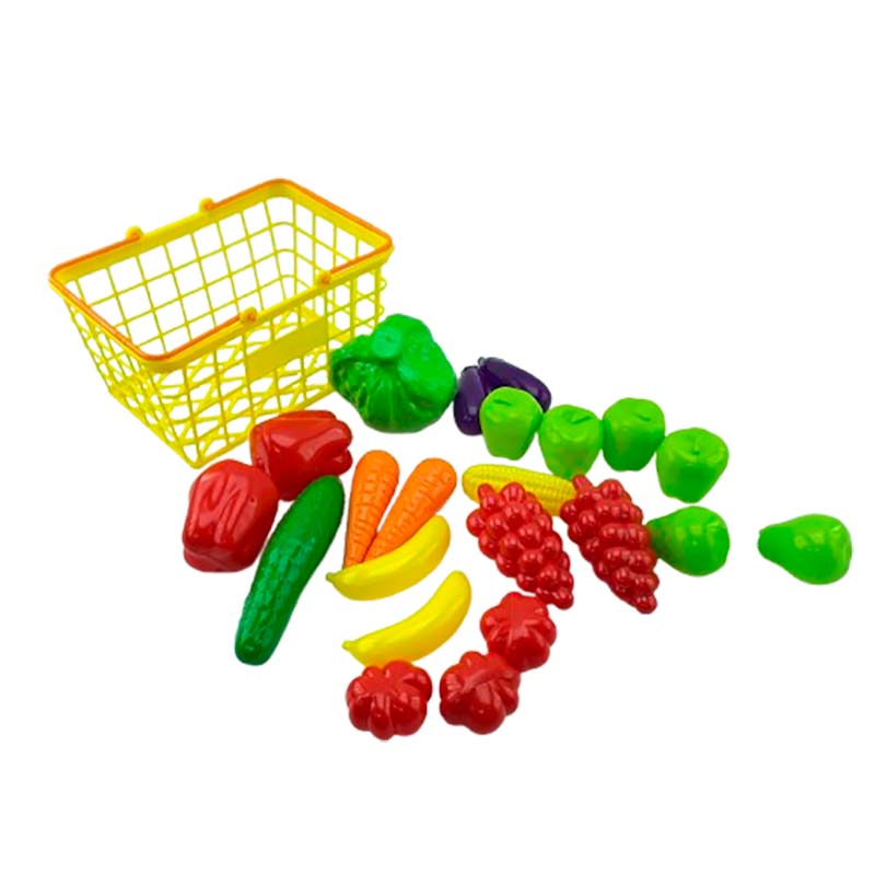 У наборі — 25 елементів: перець, морква, кукурудза, огірок, баклажани, банан та інші барвисті овочі й фрукти. Іграшки приємні на дотик і зручні для маленьких ручок, сприяють розвитку моторики та уяви.