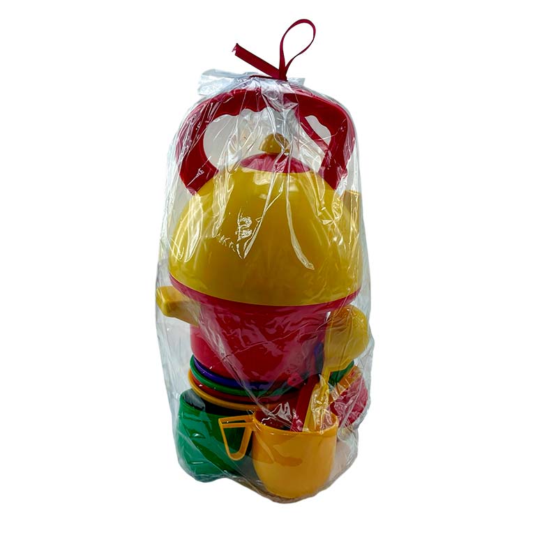 Усього 16 елементів: 1 каструля з кришкою, 1 ополоник, 1 довга виделка, 4 піали-тарілочки, 4 ложки, 4 чашки, 1 чайник.