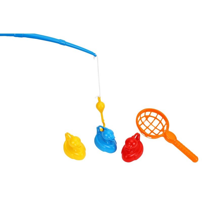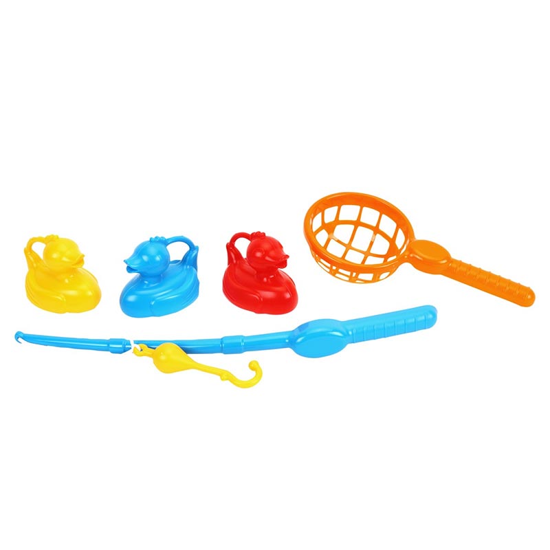У комплекті є зручна вудка з поплавком, великий підсак та 3 яскраві гумові качечки. Фігурки качок виготовлені методом видування, тому вони легкі та чудово тримаються на поверхні води.
