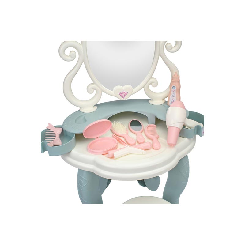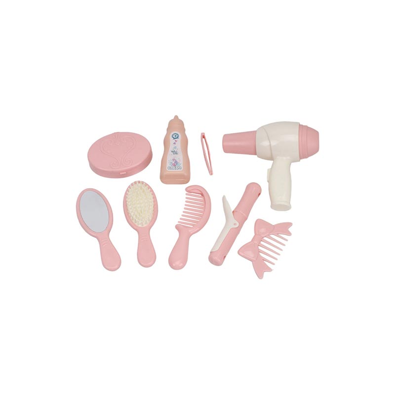 - Повний набір аксесуарів (9 шт.): гребінець, щітка, ручне дзеркальце, пінцет, заколка-гребінець, плойка, пудрениця, фен та тюбик крему – все як у дорослих.