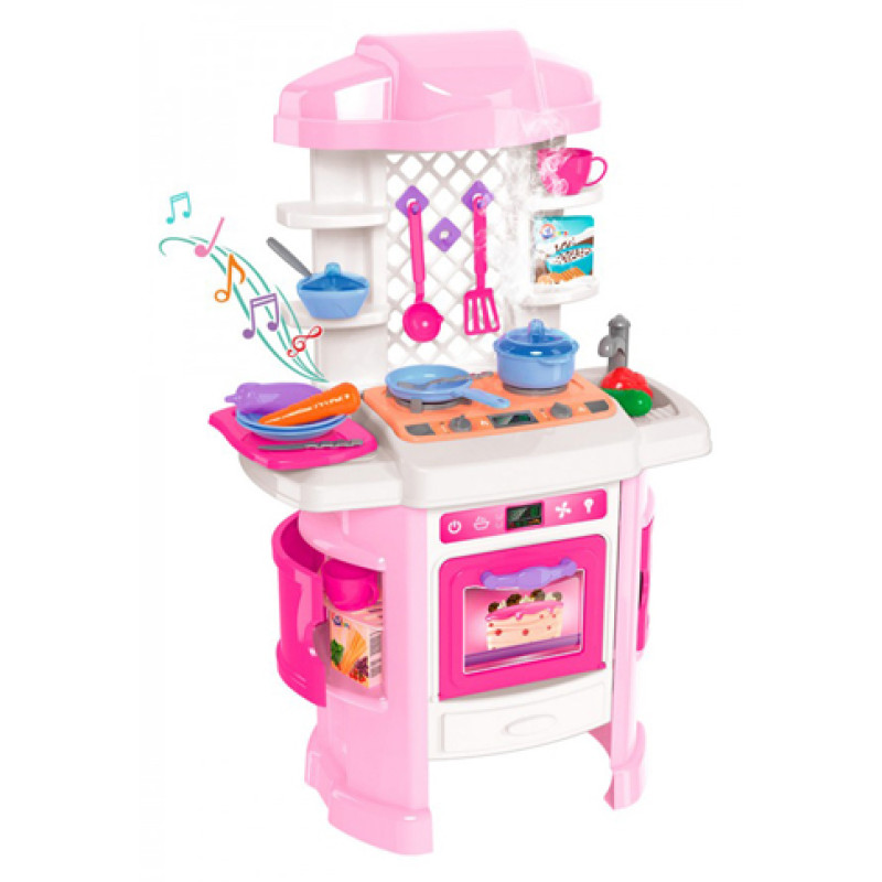 Комплектація: іграшкова кухня, варильна панель з електронним модулем, кран, дощечка, каструля з кришкою, пательня, чашка - 2шт., блюдце - 2 шт., ложка - 2 шт., виделка -2 шт., тарілка - 2 шт. цукорниця з кришкою, виделка велика, шумівка, лопатка, черпак, огірок, морква, баклажан, помідор, коробочка - 2 шт., губка.